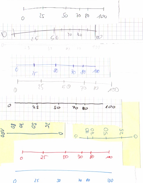 „Take a piece of paper. No matter what paper. Draw a straight line on it. As long as your hand is wide. Approximately. Not too short. Not too long. Write zero on one end. Write 100 on the other. Draw marks for 25, 50, 70, 80 on your line.“