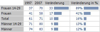 Das interessanteste Ergebnis ist darin etwas versteckt: Der Fußball zieht vor allem immer mehr jüngere Frauen in die Stadien. Deutlicher wäre das zu sehen, wenn die Grafik die Veränderung in den Blickpunkt rücken würde, zum Beispiel so:
