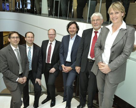 Am Ende eines guten Tages fürs Business Intelligence: Matthias Kauffmann (Porsche AG), Volker Hagemann (Leica Camera AG), Uli Drautz (Bechtle AG), Dr. Nicolas Bissantz, Professor Dr. Dr. Gerhard Roth und Jutta Kleinschmidt.