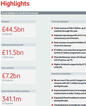 Large numbers; large and red. Source: Vodafone Group Plc, Annual Report for the Year Ended 31 March 2010, page 1.