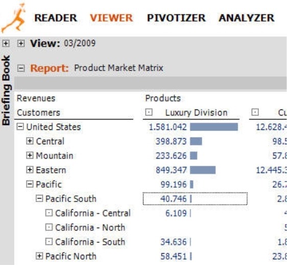 And how does this work in Viewer mode? Viewer users will be able to use the plus and minus signs to open and close the customer dimension down to the predefined level. They will not, however, be able to drill down on the product dimension. As a result, each user can determine which level of detail he or she wants to see – within the framework and as determined by the report editor in a higher level.