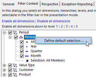 Default selection forms part of the Filter Context. This can be edited in its own tab in the Report Properties (context menu of reports in Modification Mode) in the same way as for MDX databases. You can define the Default Selection in the hierarchy context menu.