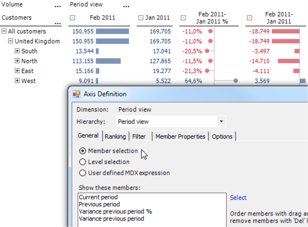 In other reports, you may need a constant order in the rows or columns. This is often the case when you are dealing with different scenarios (e.g. actuals, budget, budget-actual variance) or different time periods (e.g. current, previous period, same period last year, variances). Here, DeltaMaster should always display the report objects in the same order regardless of sorting rules or the values’ size. If you want to define a constant row or column structure, open the Axis definition, select the General tab, and choose the Member selection option. In this case, you can Select which members you want to display and in which order (i.e. same as in the list field). To change the order of the members, simply drag and drop them within the list field.