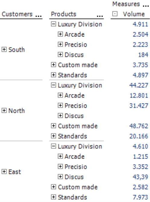If you are using nested axes, you can also use a further option. When you drill down on a member in this case, DeltaMaster will display the children of that member in all rows containing that member. Take a look at the screenshot on your right. When you drill down on the product category ‘Luxury division’, DeltaMaster will display the subcategories ‘Arcade’, ‘Precisio’, and ‘Discus’ across all customer regions.