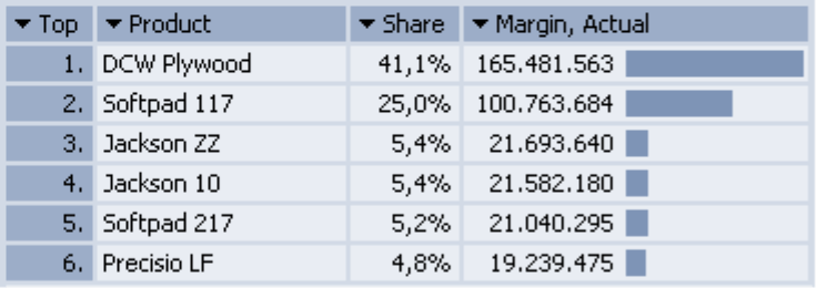 When you view the top-ten list on your right, you may be surprised that the product “DCW Plywood” (#3) generates more margin than the entire collection of standard models (#6). This function also helps you uncover compensating effects, such as when an object on a subordinate level has a greater value than one on an higher level.