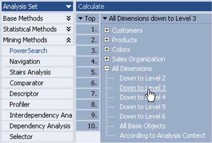 With PowerSearch, you can select All Dimensions in addition to the dimension lists used in Rankings. When you choose all dimensions, DeltaMaster searches all available dimensions of the cube and retrieves a list of the biggest and smallest objects. Dimensions are available for analysis when they are incorporated in the analysis context and they are not located on a base member in the view. Alternatively, you can limit your analysis to the top levels. If you choose “down to level 3” in the Chair data model, for example, the customer dimension would only include “country” and “region”, and the product dimension would only contain the “Product Category” and “Product Subcategory” levels. If you select All Base Objects, however, DeltaMaster will only search the base members (i.e. leaves) in the various dimensions.