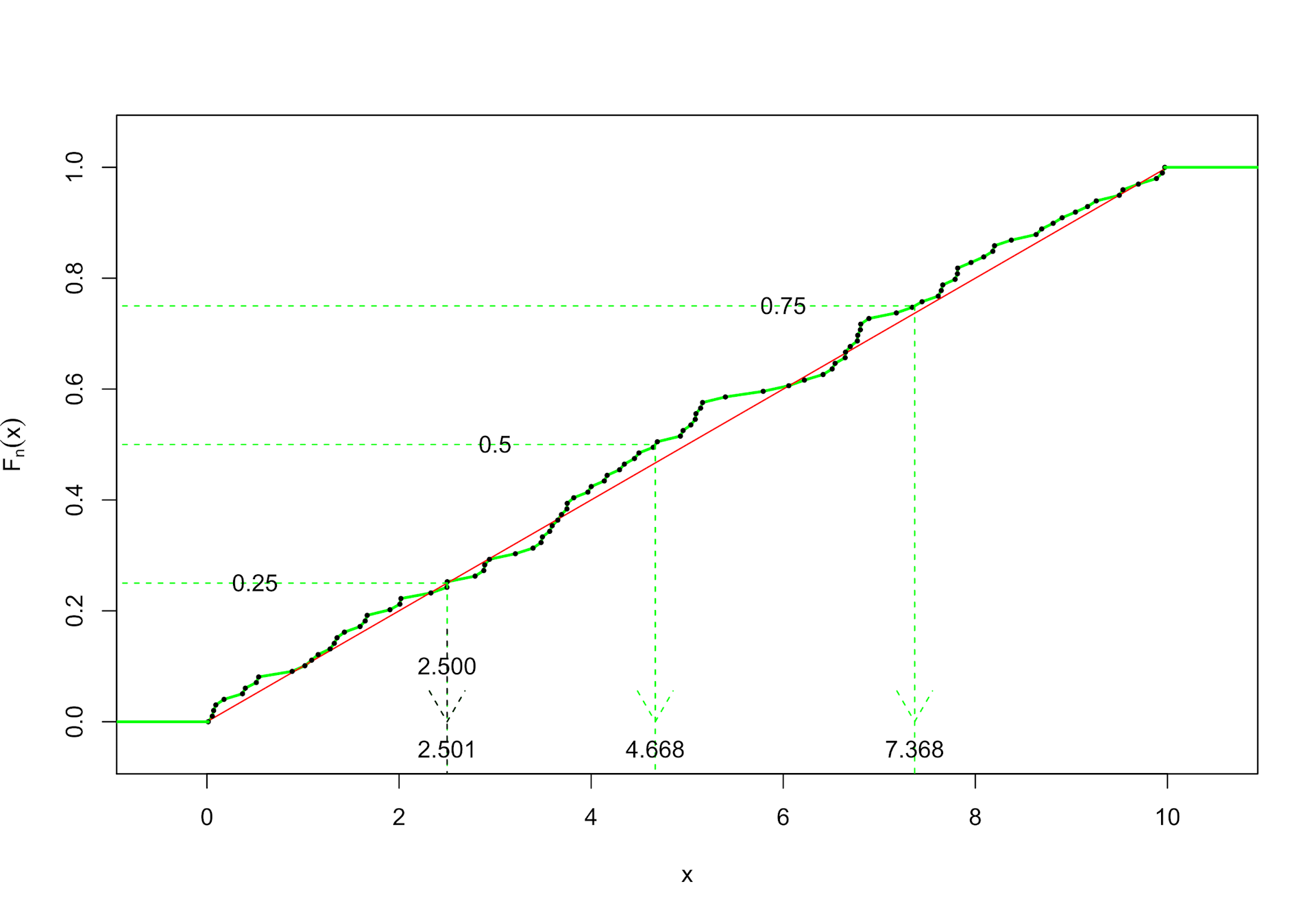 Die im theoretischen Fall geschilderte Vorgehensweise, ein Quantil zu berechnen, ist hier mit Problemen verbunden: Da die empirische Verteilungsfunktion nicht stetig ist, treffen wir die Funktion bei Projektion von links dummerweise gar nicht, wie es die Grafik im Falle des Medians (y = 0.5) vermittelt. Es kann auch sein, dass wir exakt auf der Höhe eines Segmentes liegen und somit gleich ein ganzes Intervall zu diesem Wert y gehört.