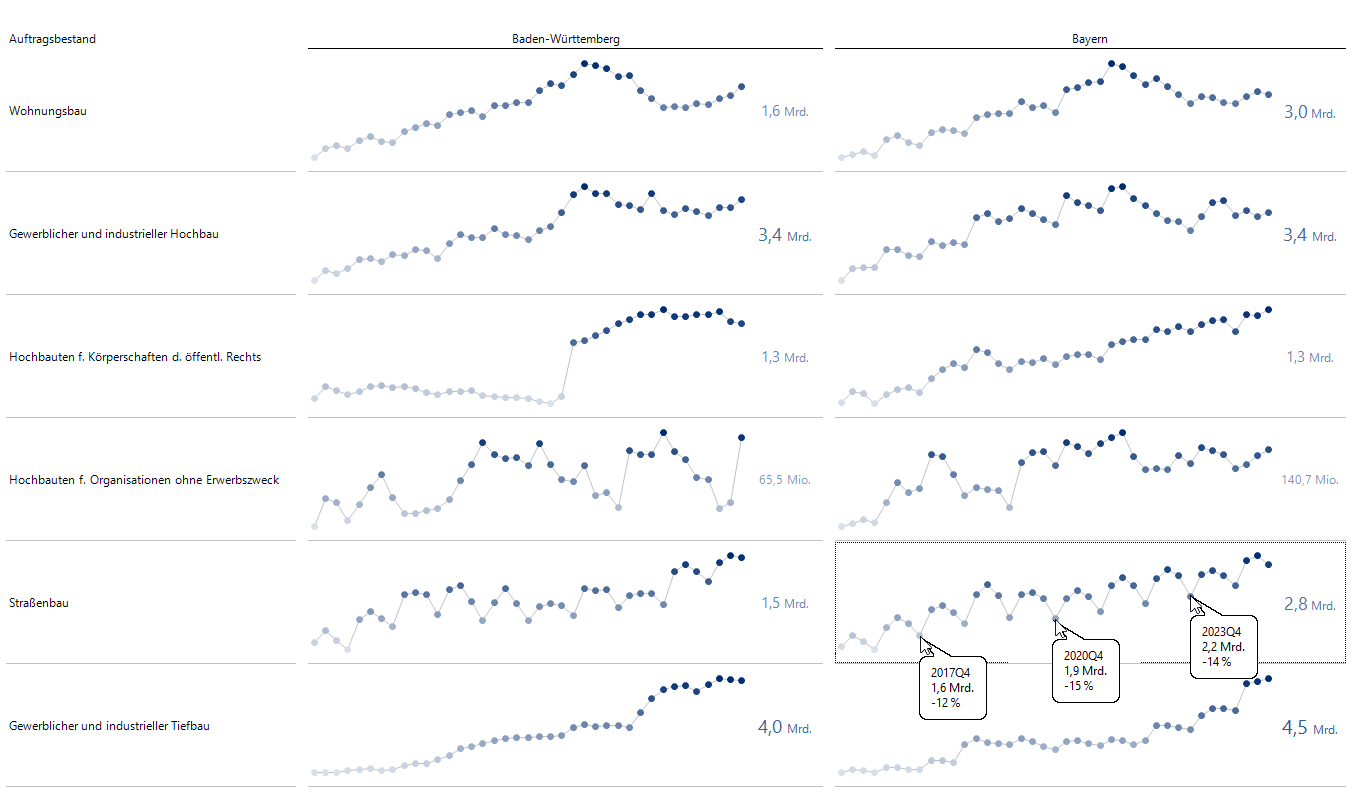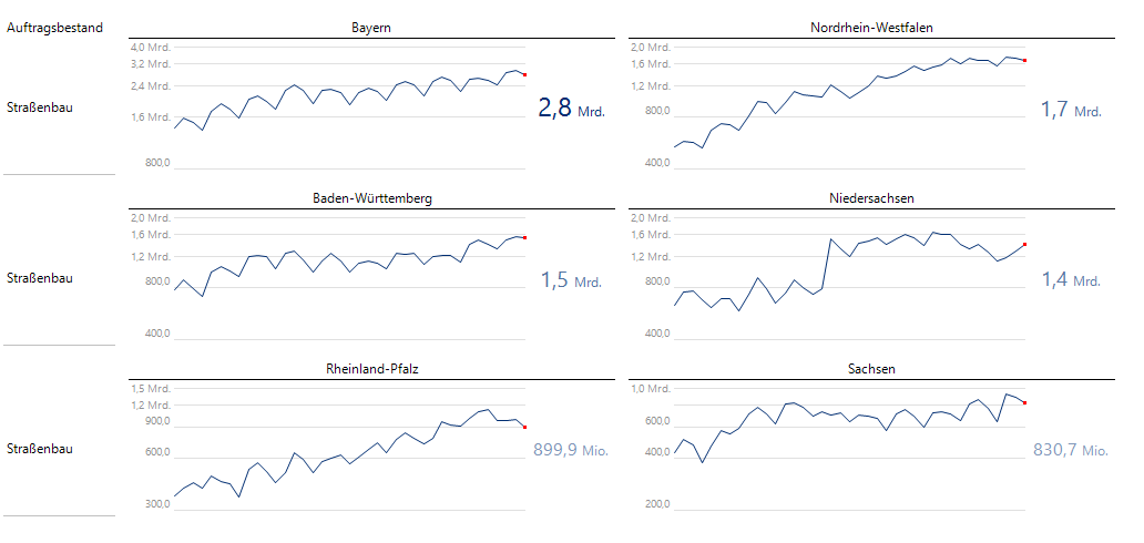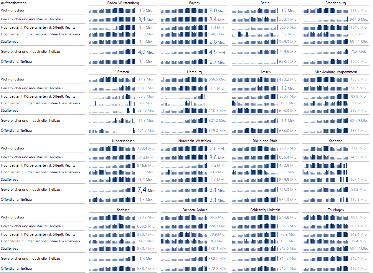So finde ich schnell heraus, dass einige Bundesländer (Niedersachsen, Bayern, Sachsen u. a.) beim gewerblichen und industriellen Tiefbau mehr als 1 Mrd. Euro beim Auftragsbestand zugelegt haben.