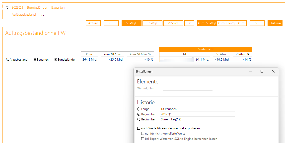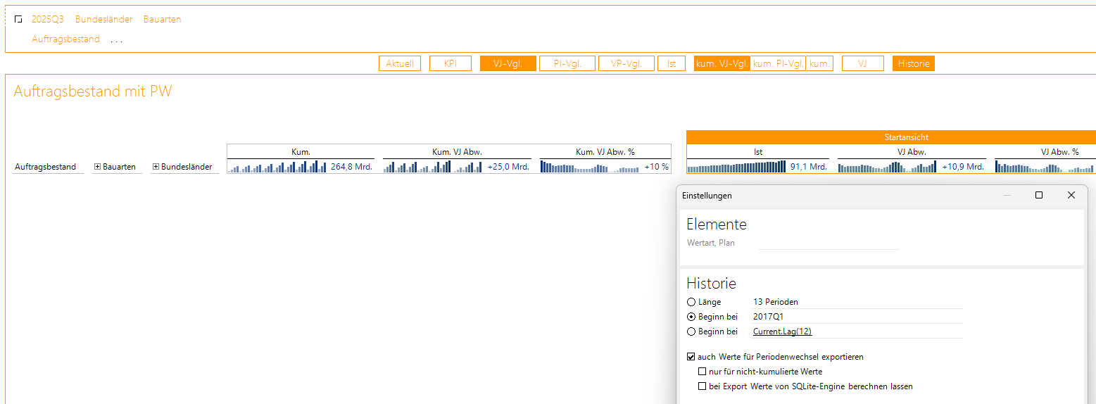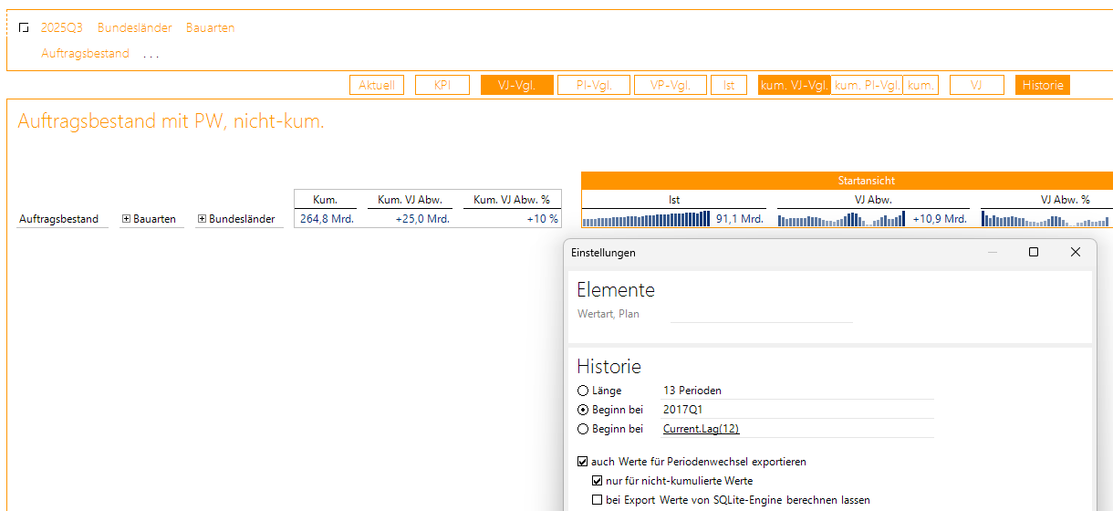 Für alle drei Varianten stehen die aktuellen Werte und die Vorjahresabweichungen der Istwerte als auch der kumulierten Werte zur Verfügung, ausgehend vom aktuellen 3. Quartal 2025.