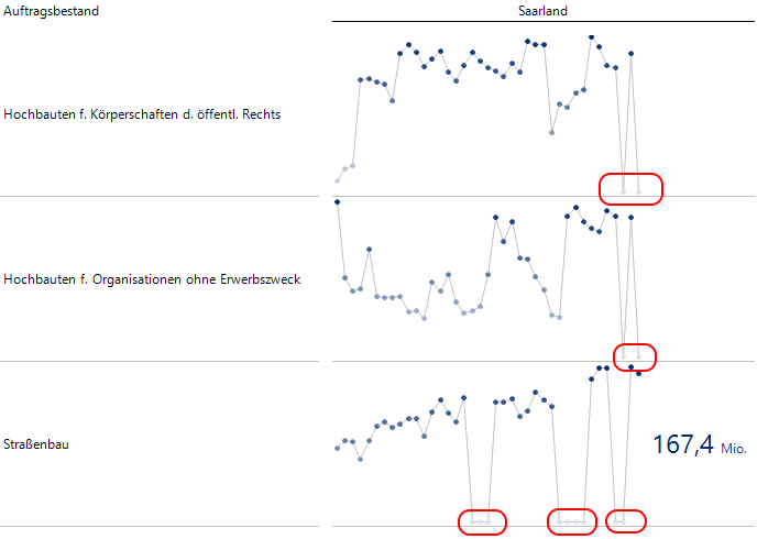 In einer Kopie filtere ich auf Bremen und den öffentlichen Tiefbau und aktiviere dann die Sparklines. Für den passenden Wert muss ich 4 Perioden zurück und erkenne dass der Anstieg von 12,6 auf 102 Mio. zu diesem hohen relativen Anstieg geführt hat.