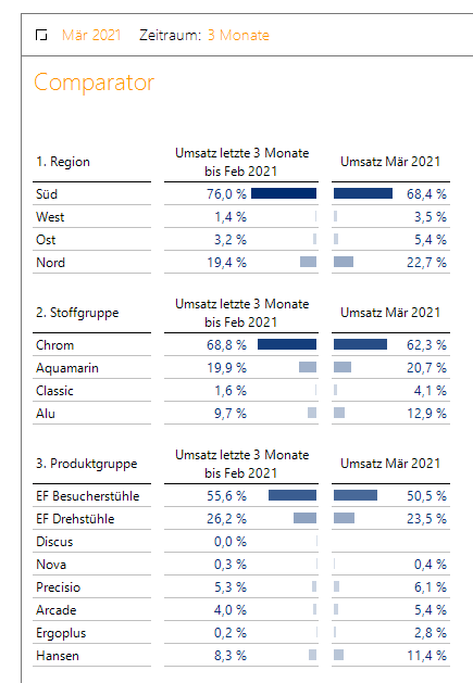 Etwa in einer Comparator-Analyse vergleichen wir die Umsatzverteilung auf den vergangenen Monaten bis zum Vormonat mit der Umsatzverteilung des aktuellen Monats.