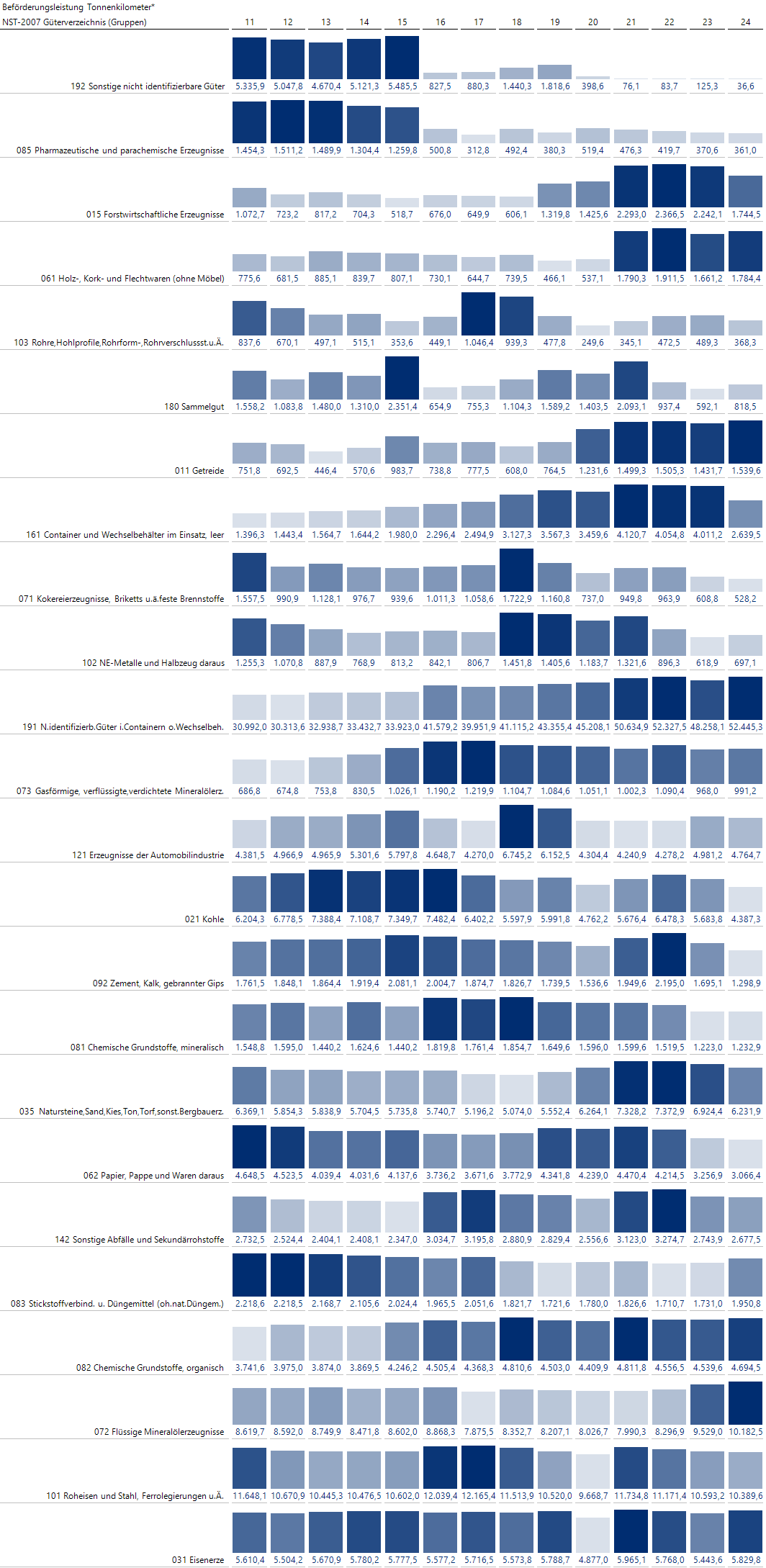 Analog zum Variationskoeffizienten habe ich nun einen univariaten Statistikwert Maximum für die Tonnenkilometer über die Jahre definiert und als Filter in der Spaltenachse benutzt. Nur diejenigen Güter sind noch sichtbar, die in mindestens einem Jahr 1 Milliarde Tonnenkilometer erreicht haben und somit in dieser Tabelle wenigstens in einem Jahr eine 1000 aufweisen können: