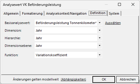 Zunächst lege ich einen univariaten Statistikwert an. Ich versuche es mit einem Variationskoeffizienten über die Jahre, mit der soeben abgeleiteten Kennzahl Beförderungsleistung Tonnenkilometer*: