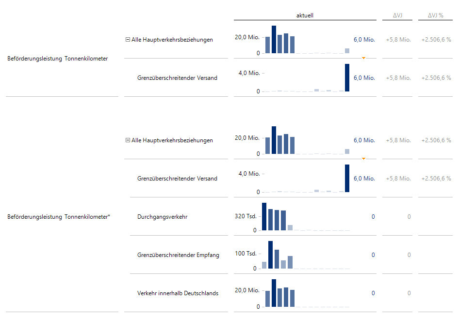 Für jeden dieser Werte können wir in die andere Dimension der Hauptverkehrsbeziehungen navigieren – auch gleichzeitig – und sehen, dass jeweils der Verkehr rein innerhalb Deutschlands mit Abstand auf dem ersten und der Durchgangsverkehr auf dem letzten Platz liegt.