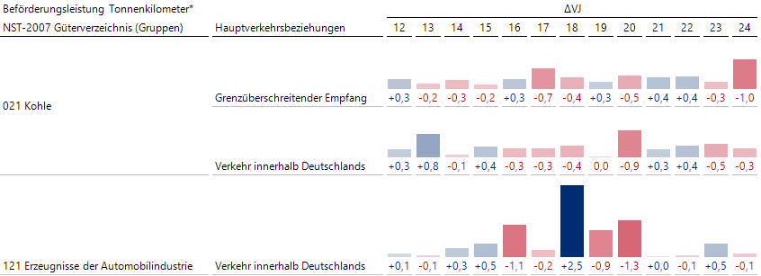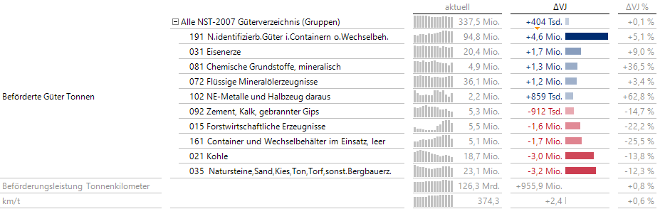 Bei der Güterverkehrsstatistik bezüglich der Änderung der Tonnen gegenüber dem Vorjahr ergibt sich das folgende Bild: