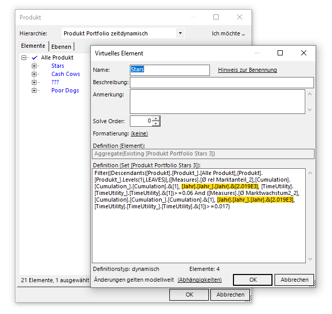 Produkt D ist nun von den Cash Cows zu den Stars gewandert. Mit dem Anlegen einer dynamischen virtuellen Hierarchie können wir die Änderung der Zahlen von D berücksichtigen, obwohl diese später stattgefunden hat. Jedoch muss sie zwingend dem Jahr 2019 zugeordnet sein.