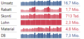 Ein Grundpfeiler unserer BI-Software DeltaMaster ist die Grafische Tabelle und Grundpfeiler der Grafischen Tabelle sind wiederum Sparklines, die bereits seit 2004 in DeltaMaster zum Einsatz kommen. Sie erlauben die kompakte, übersichtliche und sofort erfassbare Wiedergabe von Trends bei den Kennzahlen, wie z. B. hier in einer DB-Rechnung in unserer Demo-Anwendung Chair: