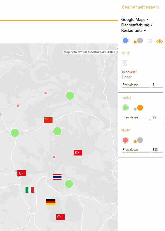 Im vorliegenden Fall verwenden wir die Elementeigenschaft Preisklasse in jeder Abfrage. Ist das Restaurant günstig, wird die Flagge, deren Pfad ebenfalls in einer weiteren Elementeigenschaft definiert ist, angezeigt. Für mittlere Preisklassen wird ein großer, grüner Kreis angezeigt und teure Restaurants erhalten den kleinen, roten Kreis.