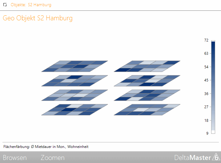 Haben wir im Datenmodell eine Hierarchie Objekt – Block – Ebene im Block – Wohneinheit angelegt und in der Modellierung den Punkt „Geo-Mappings: Gebiete für übergeordnete Ebenen entsprechend der Hierarchie zusammenfassen“ aktiviert, sind auch die üblichen Zoomen- und Browsen-Optionen verfügbar.