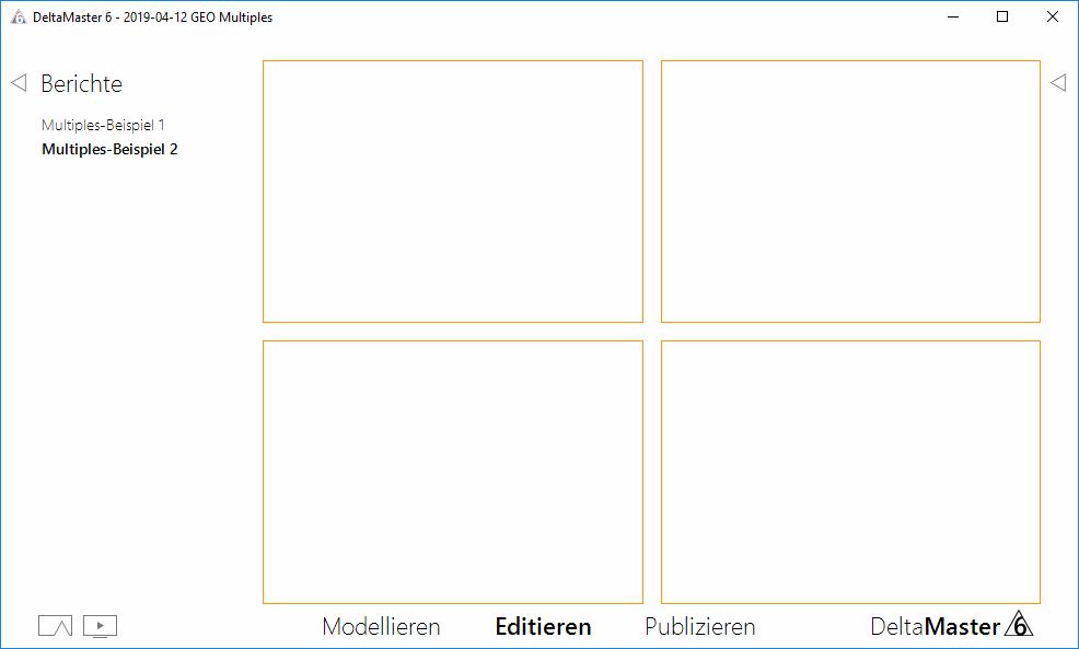 Das Erzeugen eines Multiples-Bericht ist äußerst einfach. Wird ein neuer Multiples-Bericht angelegt, ist die Arbeitsfläche zunächst viergeteilt und wäre somit für die Aufnahme von vier Berichten präpariert: