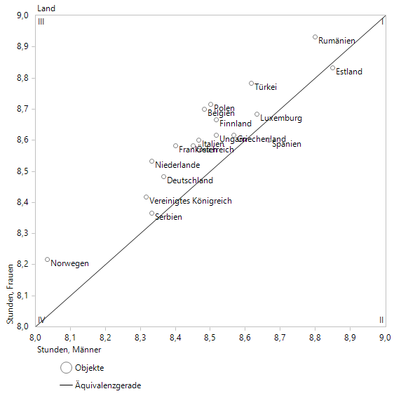 Legen wir Filterwerte der Zeitverwendungen für Männer und für Frauen an, können wir die durchschnittliche Schlafdauer der beiden Geschlechter in einer Portfolioanalyse gegenüberstellen: