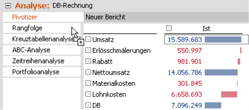 So erstellen Sie beispielsweise aus der abgebildeten Deckungsbeitragsrechnung im Nu eine Umsatzstatistik: Ziehen Sie einfach den Umsatzwert per Drag & Drop auf die Zeile Rangfolge im Analysemenü.