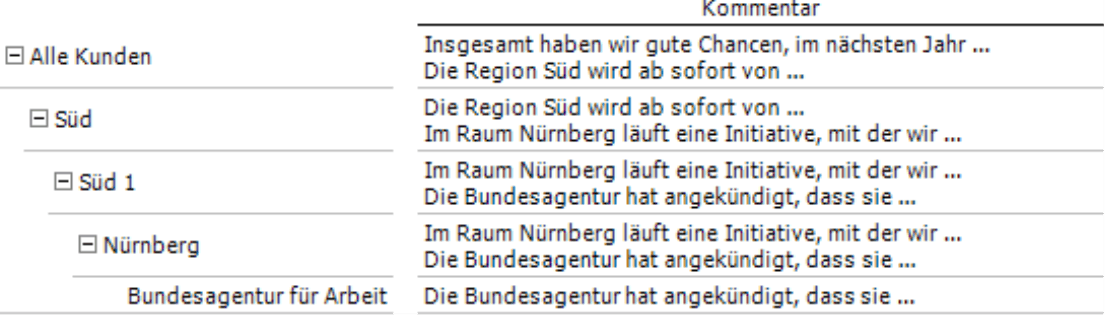 In diesem Fall werden also zu jedem Element der eigene Kommentar sowie die Kommentare aller in der Hierarchie untergeordneten Elemente dargestellt. Dies gilt auch für solche, die in der Tabelle gerade nicht zu sehen sind. Wären beispielsweise für andere Kunden im Gebiet „Süd 1“ ebenfalls Kommentare vorhanden, würden diese bei „Süd 1“ und allen höheren Elementen ebenfalls berücksichtigt.