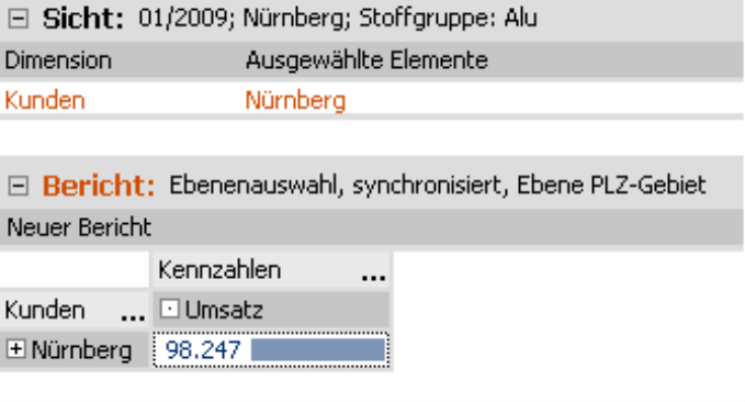 Eine gewisse Ausnahme sind Dimensionen, die selbst im Bericht vorkommen. Das Synchronisieren mit der aktuellen Sicht (Option in der Achsendefinition) führt dazu, dass keine Aggregation stattfindet, sondern die Auswahl im Fenster Sicht die Steuerung übernimmt, welche Zeilen oder Spalten in der Pivottabelle angezeigt werden sollen. Im Fenster Sicht ändert sich aber nichts; hier wird weiterhin eine Kombination von Merkmalsausprägungen eingestellt, die zulässig sein muss – und deshalb nicht unter- und übergeordnete Elemente gemeinsam enthalten darf.