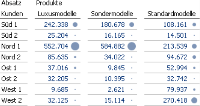Unser Beispiel ist eine Absatzstatistik aus unserem Referenzmodell „Chair“ – eine typische Auswertung aus dem Vertriebscontrolling: In der Zeilenachse sind die Kunden dargestellt, verdichtet zu Kundenregionen, in der Spaltenachse die Produkte, verdichtet zu Produkthauptgruppen. Die Kreisflächen erlauben einen visuellen Vergleich der Absatzahlen, und zwar sowohl beim Vergleichen von Spalte zu Spalte als auch von Zeile zu Zeile; das ist das Besondere an der Kreisdarstellung.