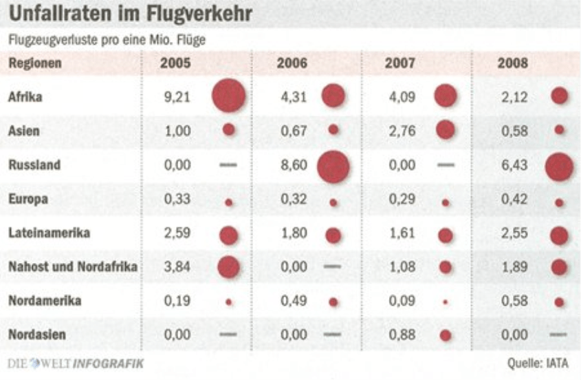 Deshalb sind die Kreise hier eine brauchbare Lösung – weil man sie in zwei Richtungen vergleichen kann. Zwar sind Flächen generell nicht so genau zu erfassen wie Längen oder Höhen, aber eine grobe Einordnung, welche Objekte kleiner sind und welche größer, ist auch mit Kreisen möglich.