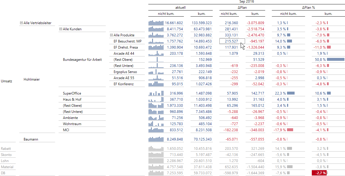 Ein Beispiel aus unserer Referenzanwendung „Chair“: Beim Umsatz möchte man zuerst nach den Vertriebsteams, dann nach den Kunden, dann nach den Produkten fragen; bei den Materialkosten hingegen zuerst nach den Stoffgruppen, dann nach den Produkten, dann nach den Kunden.