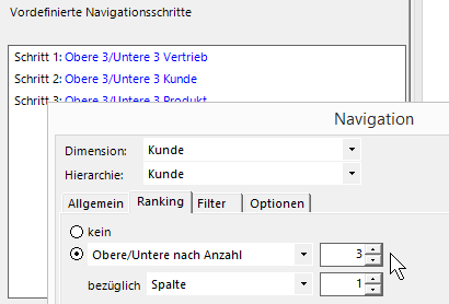 Beim Bearbeiten eines Navigationsschritts ist die Registerkarte Ranking besonders wichtig: Hier ist festzulegen, wie die Elemente zu sortieren sind und ob es eine Beschränkung auf eine bestimmte Anzahl von Elementen gibt. Für die Analysen von Abweichungen sind die Optionen „Obere/Untere nach Anzahl“ (absteigend) bzw. „Untere/Obere nach Anzahl“ (aufsteigend) besonders interessant, weil damit positive und negative Abweichungen gemeinsam in der Tabelle dargestellt werden. Der jeweils verwendete Spaltenindex richtet sich nach der Zelle, für die der Schritt ausgeführt wird. Die Sortierrichtung wird automatisch anhand des Werts der Zelle bestimmt.