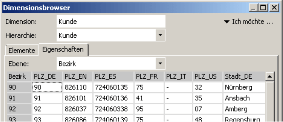 Ob das Dimensionselement selbst oder eine Elementeigenschaft die benötigten Angaben liefert, ist zum Beispiel im Dimensionsbrowser auf der Registerkarte Eigenschaften zu erkennen. Im abgebildeten Beispiel ist beides möglich: Die zweistellige Postleitzahl wird als Name der Elemente verwendet (Spalte „Bezirk“) und ist zugleich als Elementeigenschaft „PLZ_DE“ vorhanden. (Die anderen in der Abbildung gezeigten Eigenschaften werden in fremdsprachigen Versionen des Referenzmodells genutzt.)