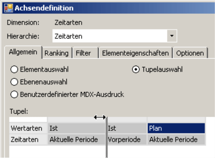 Sobald mehr als eine Dimension auf einer Achse liegt, zum Beispiel Wertarten (Ist, Plan) und Zeitarten (aktuelle Periode, Vorperiode), steht in der Achsendefinition ein vierter Auswahltyp zur Verfügung: die Tupelauswahl. Diese und den zugehörigen „Tupeleditor“ haben wir ausführlich in den DeltaMaster clicks! 01/2009 erörtert. In den damit definierten Tupeln wird jeweils ein Element aus einer Dimension mit genau einem Element aus jeder anderen beteiligten Dimension kombiniert.
