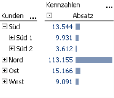 Die Wirkung sei am nebenstehenden Beispiel verdeutlicht. Der Ausgangspunkt ist eine kleine Pivottabelle mit Absatzzahlen für den Gesamtmarkt („Alle Kunden“), für Deutschland und seine vier Vertriebsregionen. In der Region „Süd“ haben wir bereits die zugehörigen Gebiete „Süd 1“ und „Süd 2“ differenziert.