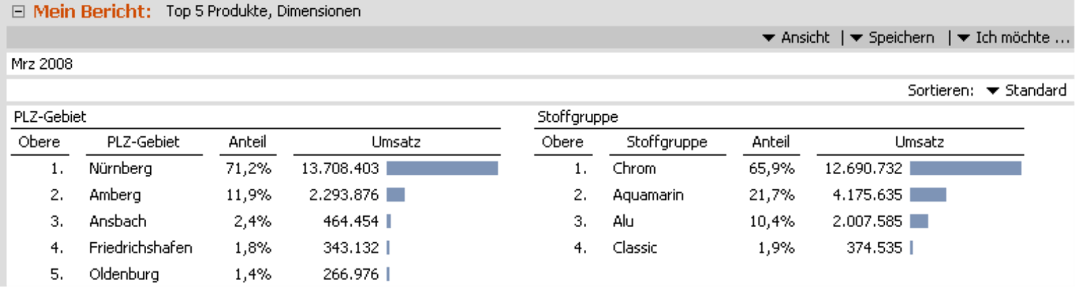 Mit dem vierten Iterationstyp, Dimensionen, machen Sie die in der Analysevorlage festgehaltene Dimension bzw. Hierarchie variabel. So erhalten wir etwa die nebenstehenden beiden Analysen, die einmal in der Kundendimension auf der Ebene der PLZ-Gebiete und einmal in der Dimension der Stoffgruppen durchgeführt wurden.