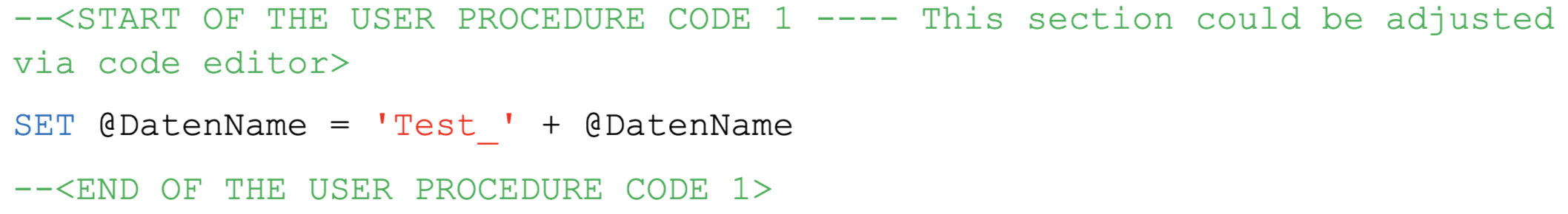 Wenn man sich nun beispielhaft die Prozedur „P_Insert_V_Daten_PreProcess“ ansieht, dann erkennt man verschiedene Code-Abschnitte, jeweils unterteilt mit den Kommentaren <Start…> und <End…>. Die Abschnitte, die mit „This section could be adjusted via code editor“ gekennzeichnet sind, könnten nun vom Kunden auf der Zielumgebung mit eigenem Code befüllt werden.