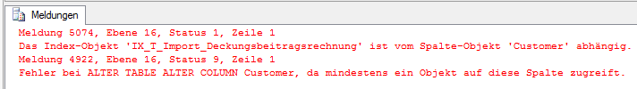 Abbildung 5: Fehlermeldung bei Datentypänderung einer indizierten Spalte