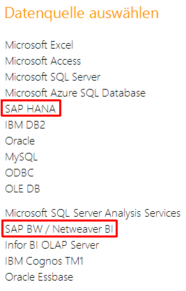 Zu Beginn eines Projekts muss ermittelt werden, welches System beim Kunden vorliegt, damit die richtige Schnittstelle in DeltaMaster ausgewählt werden kann. DeltaMaster bietet zwei Datenquellen für SAP an (s. Abbildung 1): „SAP HANA“ (relational, SQL) und „SAP BW / Netweaver BI“ (OLAP, MDX).