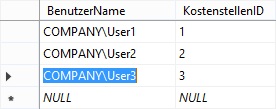 Wird eine Zuordnung über die DeltaMaster-Pflegeanwendung vorgenommen, wird diese Information im gezeigten Beispiel in der Tabelle T_D_Mapping_Benutzer_Kostenstelle gespeichert.