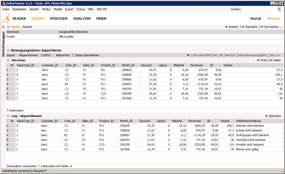 Nach Abschluss des Importes werden in der Statusleiste die Anzahl der verarbeiteten Datensätze und die Anzahl der Fehler angezeigt. Zusätzlich werden unter dem Vorschaufenster die fehlerhaften Datensätze mit den entsprechenden Fehlermeldungen aufgeführt.