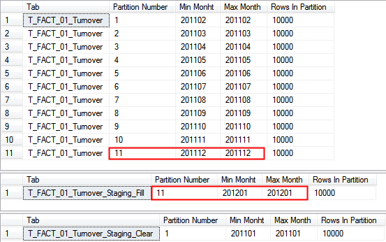 Hierbei sehen wir, dass die neuen Daten in der Partition mit der ID 11 landen, genau wie die Daten aus Dezember 2011. Dies verletzt einen wichtigen Grundsatz der Partitionierung. Bei einem „Partition Switch“ muss das Ziel, also die Partition, in welche die Daten verschoben werden, immer leer sein. Dies ist in dem Fall nicht gegeben. Beim Löschen war dies anders, da das Ziel die ohnehin leere Staging-Tabelle T_FACT_01_Turnover_Staging_Clear war. Jetzt verschieben wir die Daten allerdings anders herum, also von der Staging-Tabelle in die Faktentabelle.