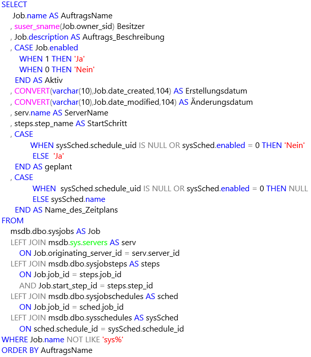 Wer sich noch mehr mit diesem Thema beschäftigen möchte, dem sei folgender Link empfohlen: https://www.mssqltips.com/sqlservertip/2561/querying-sql-server-agent-job-information/