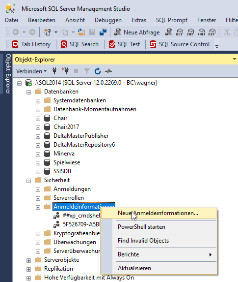 Als erstes müssen dem SQL Server die Login-Informationen bekannt gemacht werden. Hierfür öffnen wir das SQL Server Management Studio, verbinden uns auf den Server und navigieren zu dem Punkt Sicherheit -> Anmeldeinformationen.