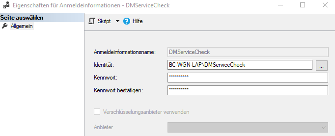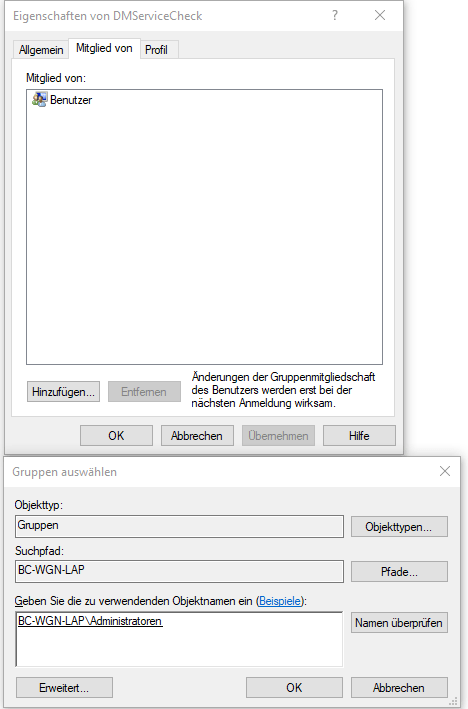 Ausgeführt als Benutzer: “BC-WGN-LAP\DMServiceCheck“.