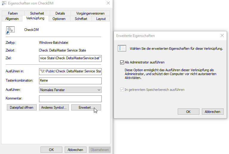 Wie erwartet, erhalten wir eine Fehlermeldung, dass der Zugriff beim Starten des Service verweigert wurde. Hintergrund ist, dass Administratorenrechte für das Starten des Service von Nöten sind. Da Batchdateien leider nicht wie etwa eine .exe-Datei mit administrativen Rechten gestartet werden können, müssen wir hier auf einen kleinen Trick in Windows zurückgreifen. Hierzu erstellen wir eine Verknüpfung auf die eben erstellte Batchdatei und teilen dieser mit, dass sie immer mit administrativen Rechten ausgeführt werden soll.
