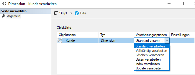 Zur Aktualisierung der Dimension muss auf die Option „Hinzufügung verarbeiten“ zurückgegriffen werden und für die Measuregroups auf die Option „Vollständig verarbeiten“.
