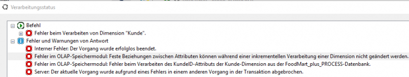 Führt man diese jedoch aus, ohne sich zuvor um die neu hinzugekommenen Dimensionselemente gekümmert zu haben, so kommt es zum Fehler während der Verarbeitung (ähnlich einem Foreign-Key-Fehler im Snowflake Schema), sofern diese neuen Elemente auch in der entsprechenden Measuregroup verwendet werden.