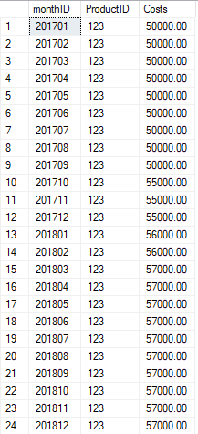 Die neu erstellte Tabelle enthält Kosten für verschiedene Produkte (hier nur durch die entsprechenden ProduktIDs dargestellt) und Monate. Die Kosten ändern sich in unregelmäßigen Abständen und sind nur für die Monate eingetragen, an denen sich der Wert tatsächlich ändert. Um auch in den Monaten, für welche keine Werte vorhanden sind, mit den Kosten rechnen zu können, werden mit folgendem SQL-Statement die Werte für die fehlenden Monate ergänzt: