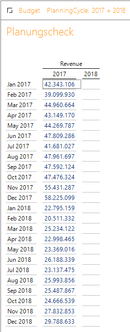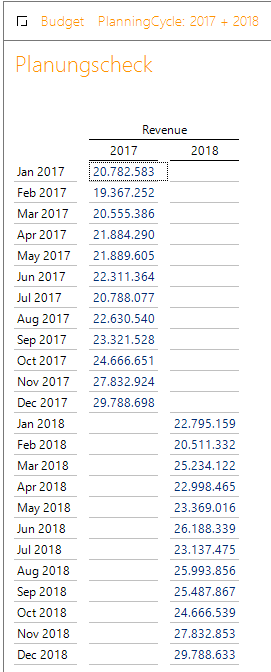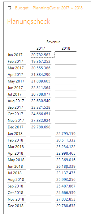 In den Zeilen stehen die einzelnen Monate für 2017 und 2018 und in den Spalten stehen die beiden PlanningCycle 2017 und 2018. Alles prima, so soll es sein.